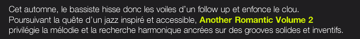 Cet automne, le bassiste hisse donc les voiles d’un follow up et enfonce le clou. Poursuivant la quête d’un jazz inspiré et accessible, Another Romantic Volume 2 privilégie la mélodie et la recherche harmonique ancrées sur des grooves solides et inventifs.